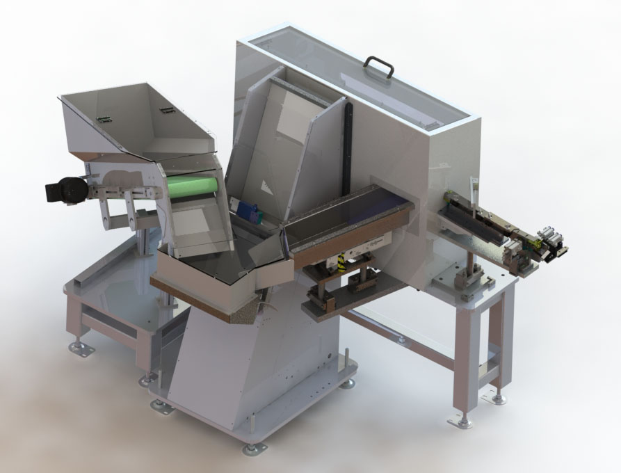 Nuestros clientes necesitaban un sistema de alimentación de piezas metódico, así como un diseño que ahorrará espacio. Un sistema de alimentación de piezas compacto con un alimentador escalonado integrado.